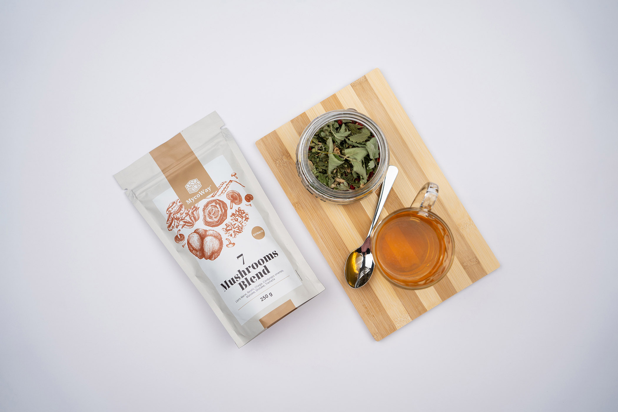 Ingrediënten: extract van leeuwenmanen (Hericium erinaceus) 12:1 in poedervorm, extract van reishi (Ganoderma lucidum) 4:1 in poedervorm, extract van chaga (Inonotus obliquus) 12:1 in poedervorm, extract van Cordyceps sinensis 12:1 in poedervorm, extract van maitake (Grifola frondosa) 4:1 in poedervorm, extract van shiitake (Lentinula edodes) 4:1 in poedervorm, extract van tremella (Tremella fuciformis) 4:1 in poedervorm.